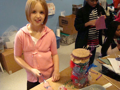 Making our own drum!! Over a hundred kids and adults were spread out on tables, spilling into the art exhibit area; cups of white glue, feathers, wire, ribbons, glitter, paper, fabric—an artist’s squirrel’s nest of wonderful things to create with. It was bonanza time! Emma and Grammy had to look hard for a place to stand to create a drum. Finally a helper at the museum squeezed us into a tiny spot at a table, handed us some cardboard “bowls” to tape together to form the drum and a cup of glue…then said, help yourselves to whatever you would like. And we did…
